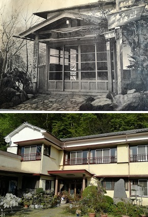 - 上は火災で焼失する前の旧三太旅館。下は現在の三太旅館