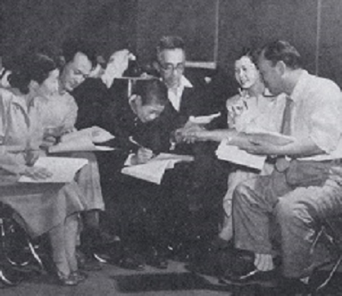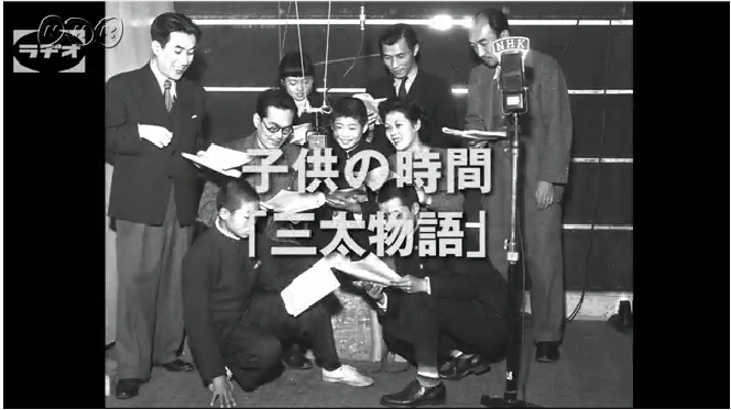 - 「放送打合せ風景」(右から 善田英夫(演出)、花荻先生(永井百合子)、青木茂(原作)、 金田明(三太)、筒井啓介(脚色)、柳文代(母) 三太物語 第2部より